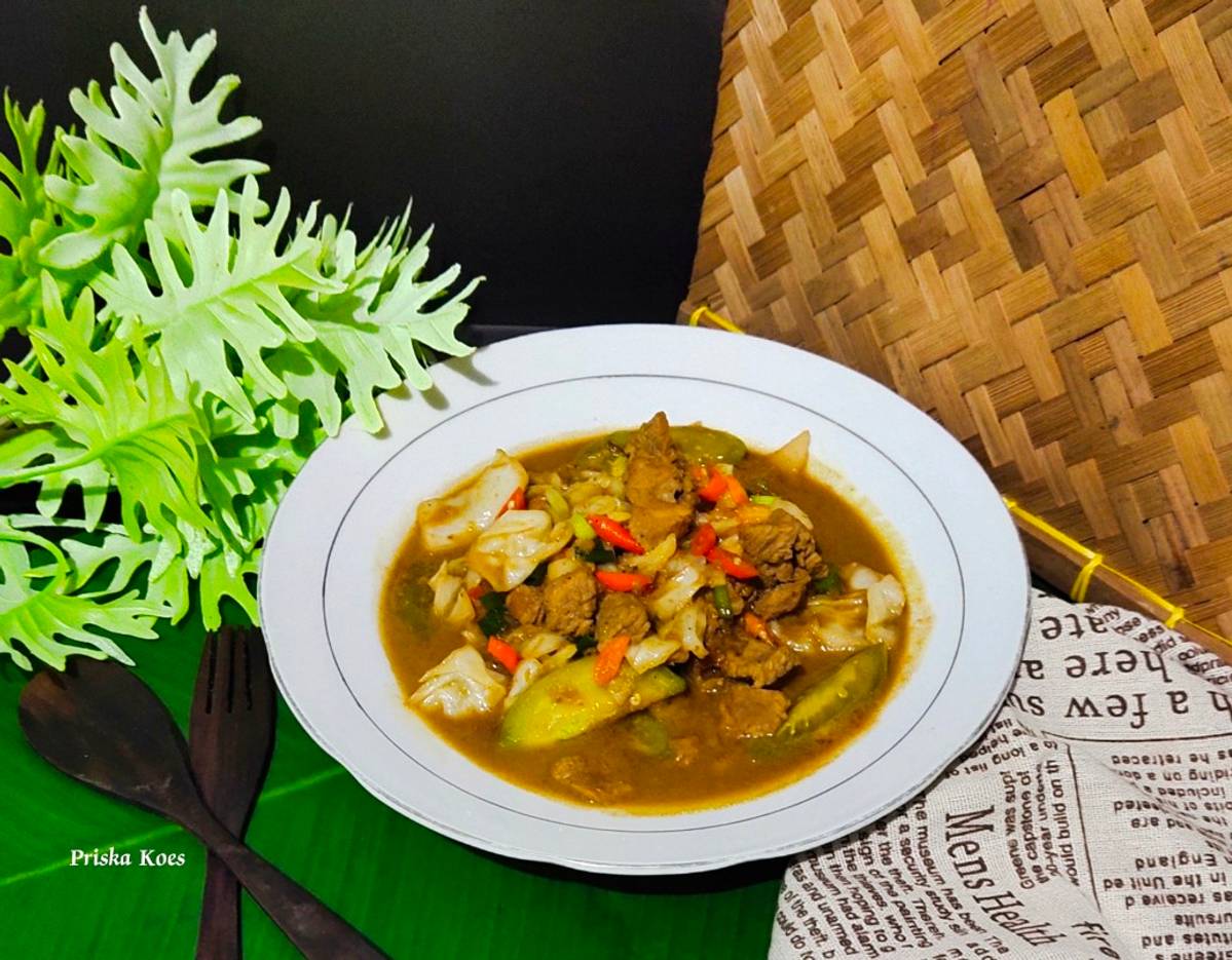2. Tumis bumbu halus dan bumbu Cemplung hingga harum. Masukkan irisan daging sapi. Tambahkan air biarkan empuk dagingnya. Tutup wajan.