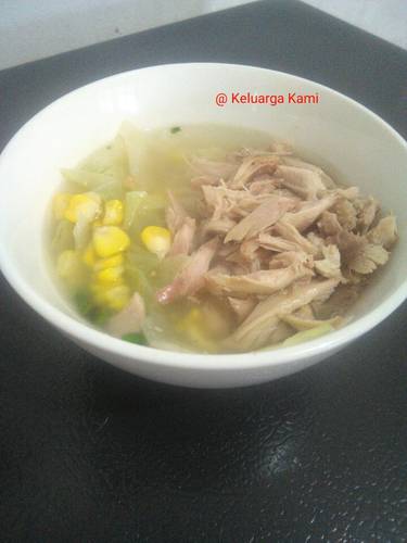 Sayur sop ayam suwir, kol, jagung siap dihidangkan