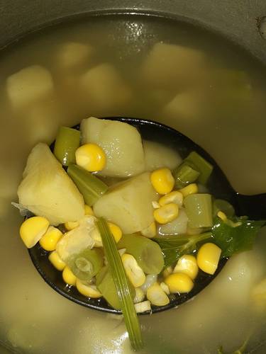 Tambahkan lada, penyedap rasa, kaldu jamur, garam secukupnya. Koreksi rasa. Tunggu sampai matang / lunak. Sup kentang, jagung, buncis siap di nikmati ❤